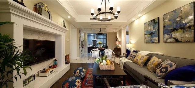 电视墙一个壁炉造型刚好嵌入电视机,这也是美式典型的设计手法,成功营造出美式简约而不简单的空间。
