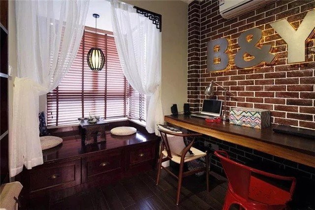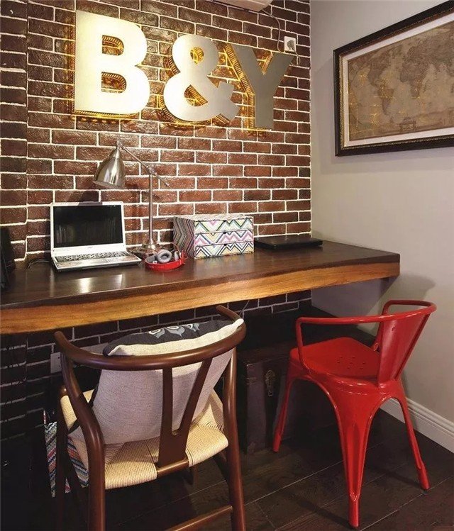 木质感的书桌,在红砖质感的墙纸下,侧边挂上一幅美式范的地图,让粗犷质感的空间显得优雅自然。