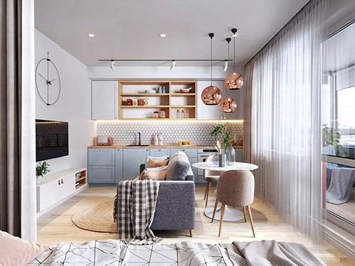 受面积限制,客厅的布局往往需要重新调整,不再是一个独立的空间,而是通过开放式的手法,与厨房、餐厅、卧室相连,尽可能在小空间中,满足功能区的多样化,沙发、餐桌椅都应是小巧灵动的,橱柜也尽量选择定制,充分利用好室内的每一空间,同时必须保证的,是绝佳的采光!