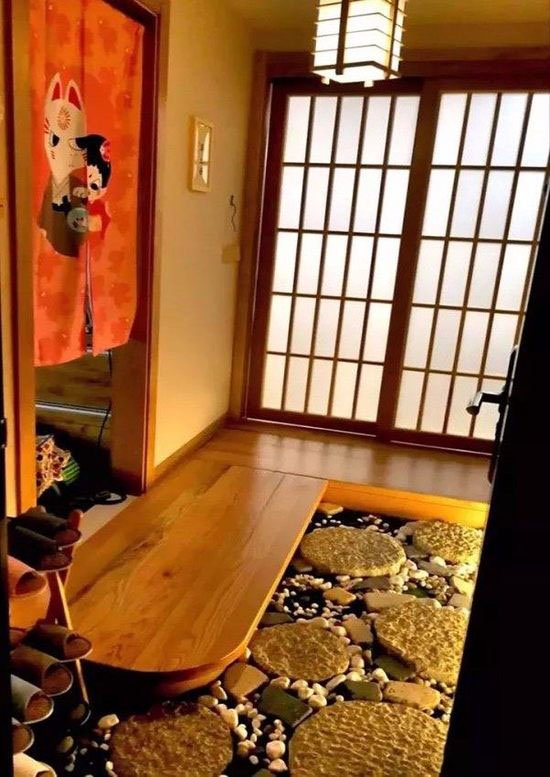 【玄关】玄关地面用庭院踏步石铺贴,搭配木地板的使用,赤着脚踩在上面,能够很好地与大自然接触。两侧墙面上的“早上好”和“晚安”问候语,让进出的家人都能感受到家的温馨。